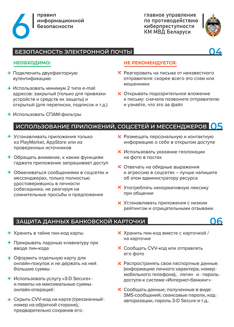 Рекомендации для сотрудников правоохранительных органов. Постоянно повышайте свою осведомленность о новых видах и схемах кибермошенничества. Следите за новостями, аналитическими материалами и рекомендациями профильных ведомств. Особое внимание уделяйте уязвимым категориям граждан: пожилым людям, несовершеннолетние, а также тем, кто активно пользуется интернетом, но недостаточно осведомлен о рисках. Подчеркивайте важность критического мышления: учите граждан проверять любую информацию, особенно ту, что вызывает беспокойство или предлагает легкую прибыль. Объясняйте, что правоохранительные органы, банки и государственные структуры никогда не запрашивают конфиденциальные данные по телефону или в мессенджерах и не требуют переводить деньги на «безопасные» счета. Акцентируйте внимание на ответственности «дропов», чтобы граждане понимали риски предоставления своих счетов третьим лицам. Разъясняйте правила легального оборота криптовалют в Республике Беларусь.