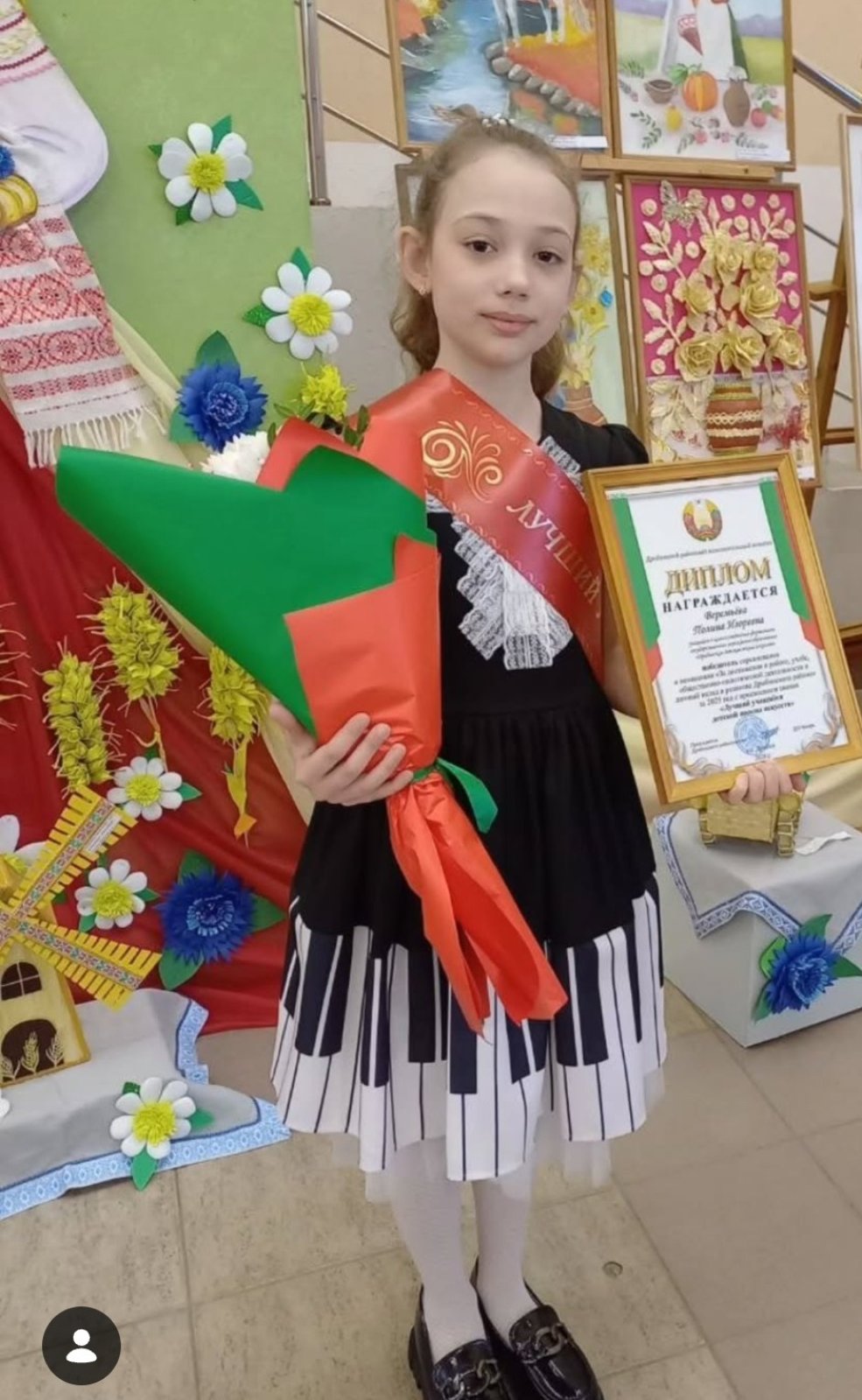 -Веремьёва Полина Игоревна - учащаяся 4 класса отделения фортепиано - победитель соревнования в номинации «За достижение в работе, учёбе, общественно-политической деятельности и личный вклад в развитие Дрибинского района» за 2025 год с присвоением звания -«Лучший учащийся детской школы искусств».