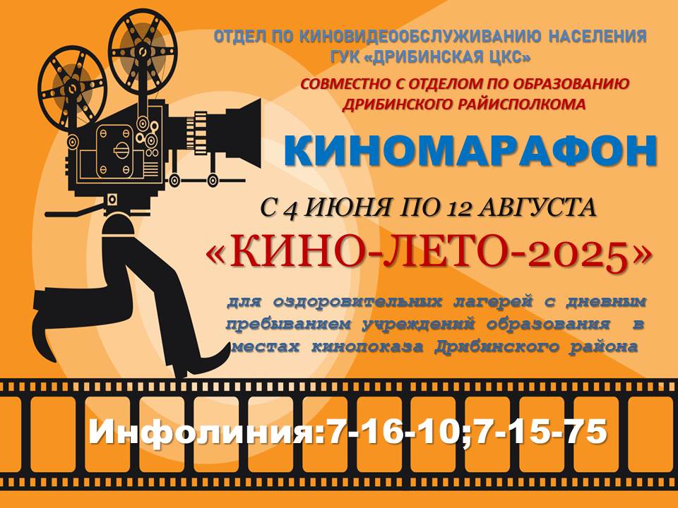 4 июня 2025 года в районном Центре культуры стартовал киномарафон «Кино-лето-2025», который пройдет во всех местах кинопоказа учреждений культуры с 4 июня по 12 августа для воспитанников оздоровительных лагерей с дневным пребыванием учреждений образования Дрибинского района. Открыли киномарафон заведующий отделом по киновидеообслуживанию населения ГУК «Дрибинская централизованная клубная система» Павел Емельянов и руководитель 1-й смены оздоровительного лагеря «Дружный» ГУО «Дрибинская средняя школа» Нелли Шуткова. Они рассказали ребятам о предстоящей программе киномарафона, которая подготовлена для них в рамках этого киномероприятия. Затем для нашего юного зрителя состоялась премьера анимационно-документального альманаха «Мемориальные комплексы Беларуси — 2», созданного Национальной киностудией «Беларусьфильм». Вторая часть альманаха рассказывает о пяти уникальных мемориальных комплексах, посвященных событиям, происходившим в Беларуси во времена Великой Отечественной войны: «Три побега из Шталага 352», «Хатынь — непокоренная деревня», «О чем молчат эти болота», «Алесь Махнач. Слово о Брестской крепости», «За нашу Советскую Родину».