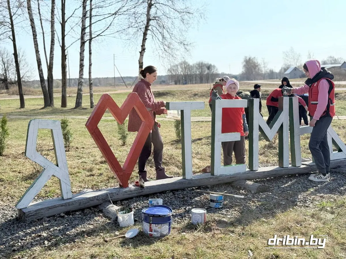 Активная работа по благоустройству в субботу велась не только в райцентре, но и на территории всех сельских Советов. В агрогородке Темный Лес представители Михеевского сельского Совета, работники школы и учащиеся, волонтеры Красного Креста, местные жители наводили порядок в своем населенном пункте. Одна из локаций — малая архитектурная форма с названием агрогородка.